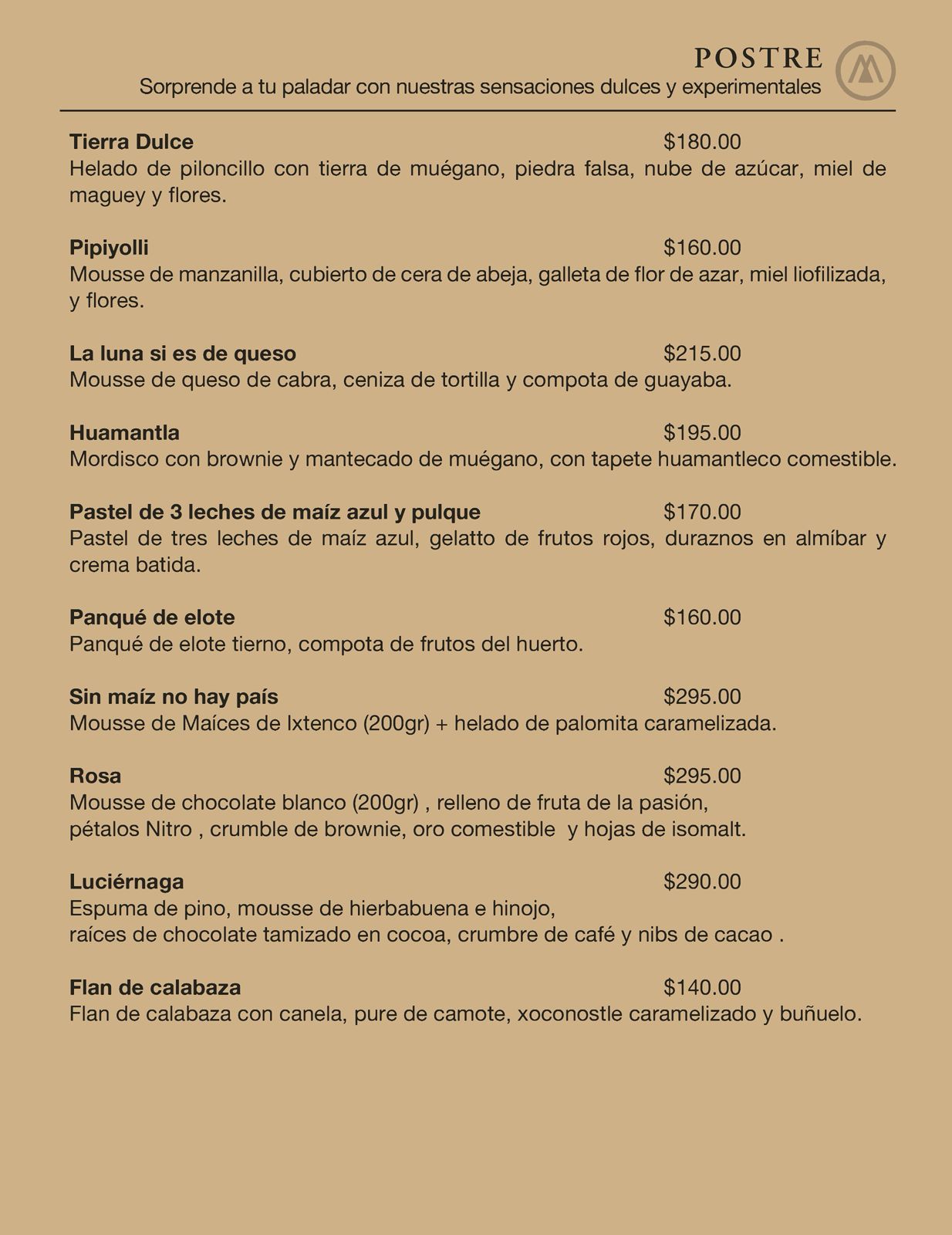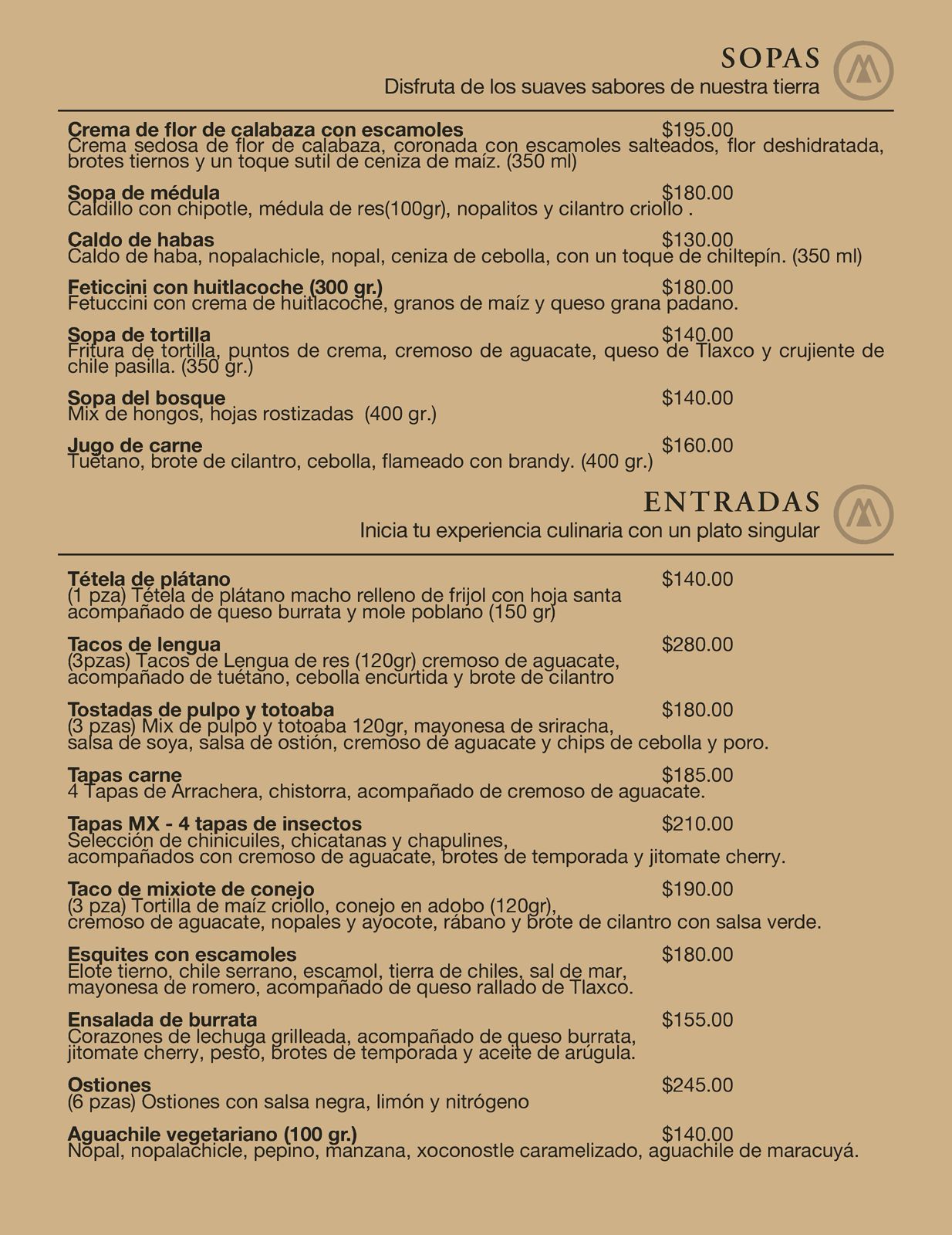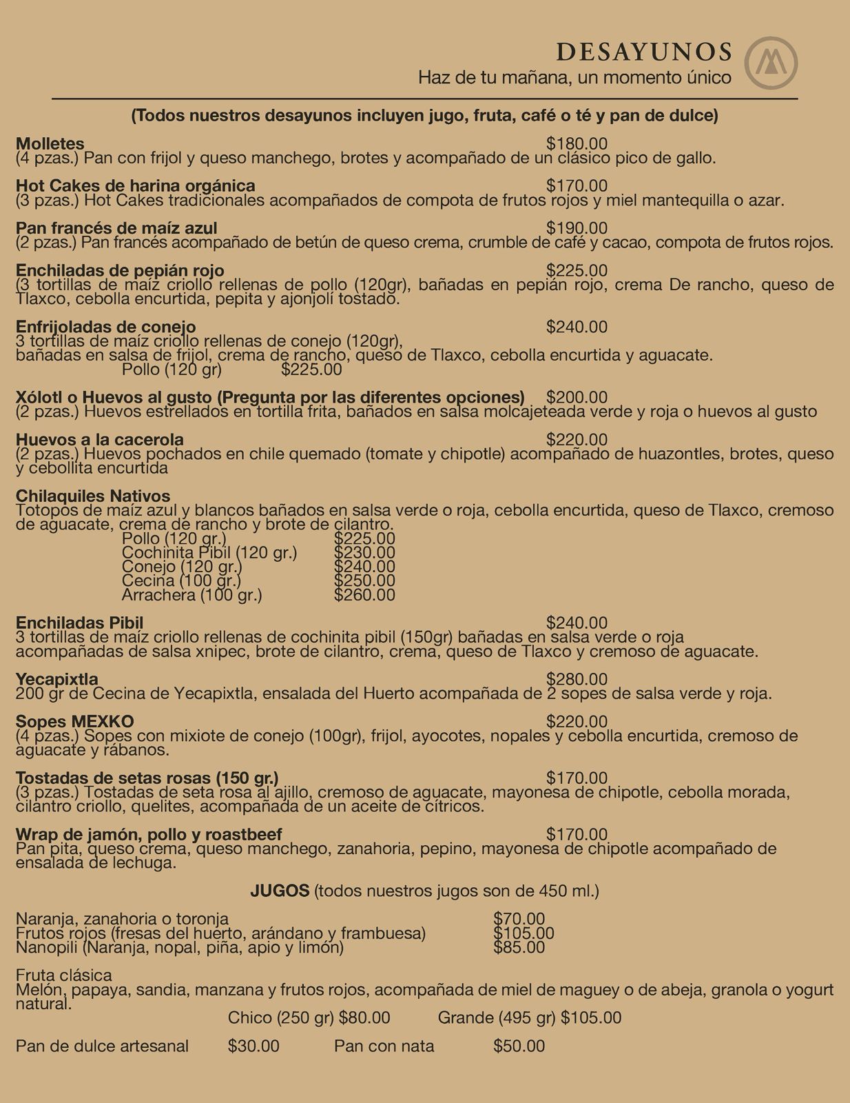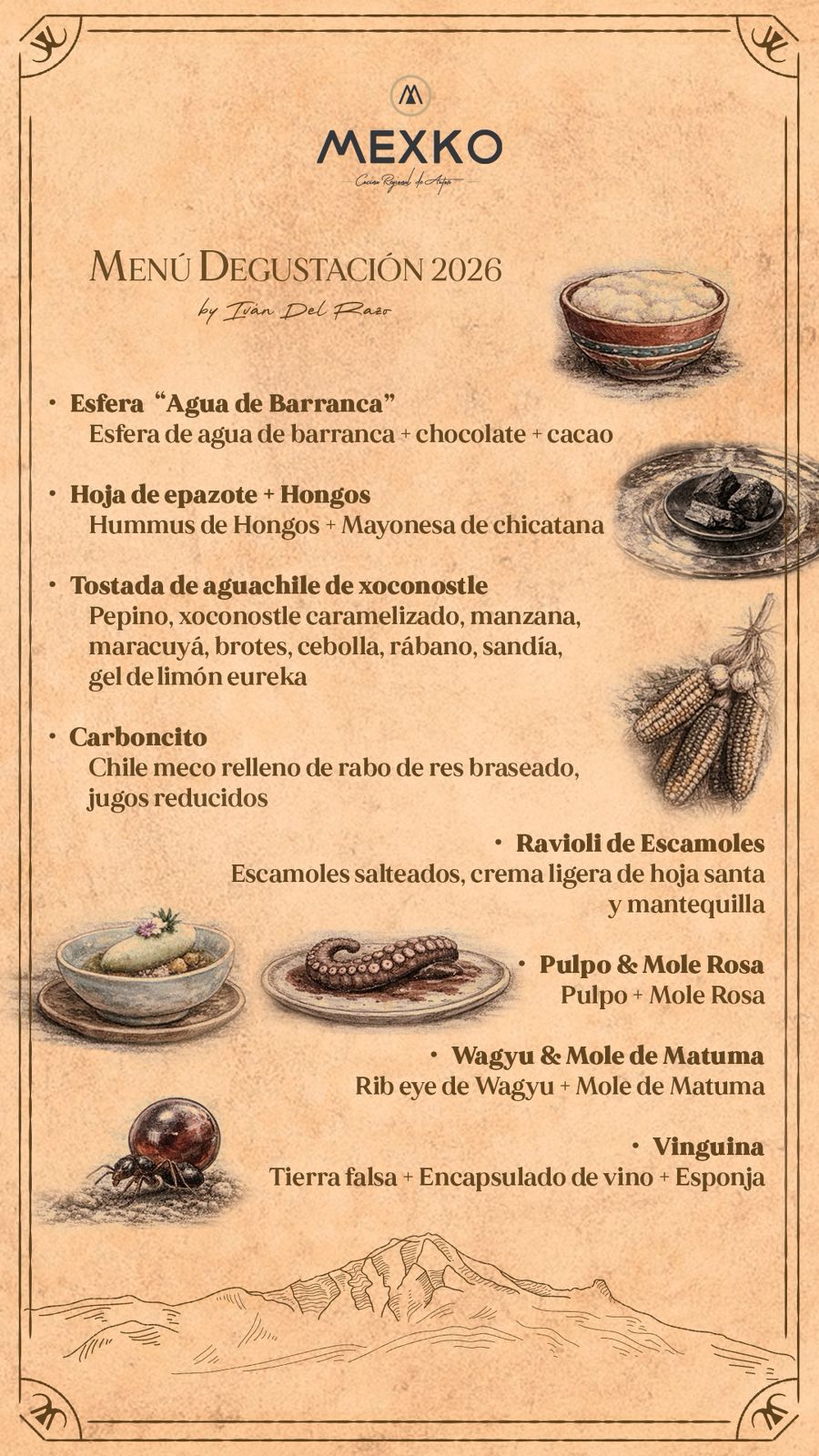 Mexko ofrece un estilo personal de cocina mexicana mediante la combinación de técnicas tradicionales, contemporáneas y de investigación para crear una experiencia única de sabor y servicio; apoyando el comercio local, a través de la selección de productos de calidad para mostrar la riqueza gastronómica y cultural de nuestro México, Los alimentos se deconstruyen y luego se reconstruyen para parecerse a otra cosa sin cambiar la receta tradicional.